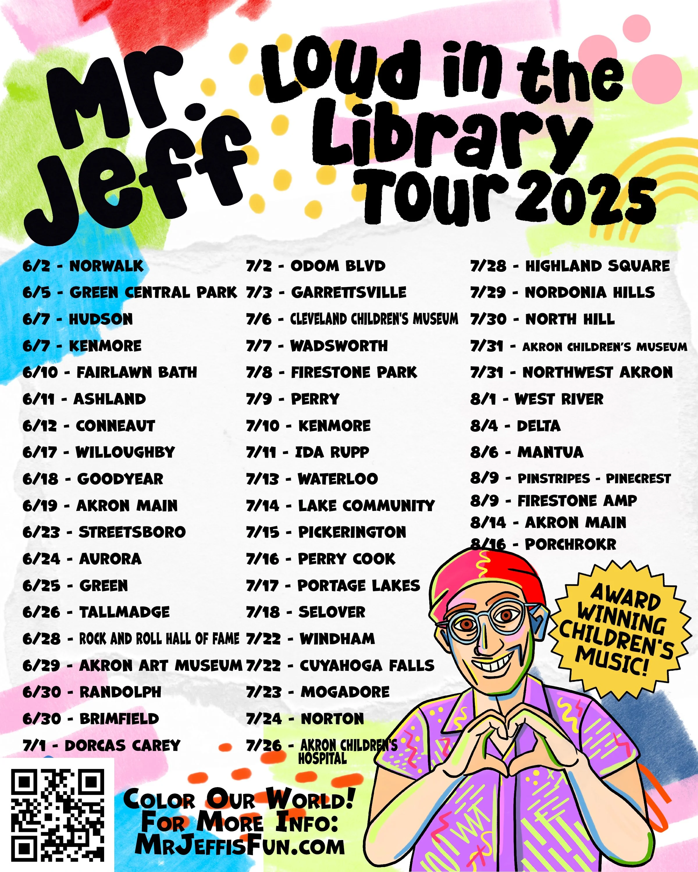 His high-energy, interactive live shows combine gross motor movement, social-emotional learning, and a healthy dose of silliness, leaving kids ready for a nap—and parents asking for more! Perfect for libraries, schools, festivals, museums, and family-friendly events, Mr. Jeff’s performances are designed to captivate and engage audiences of all ages.